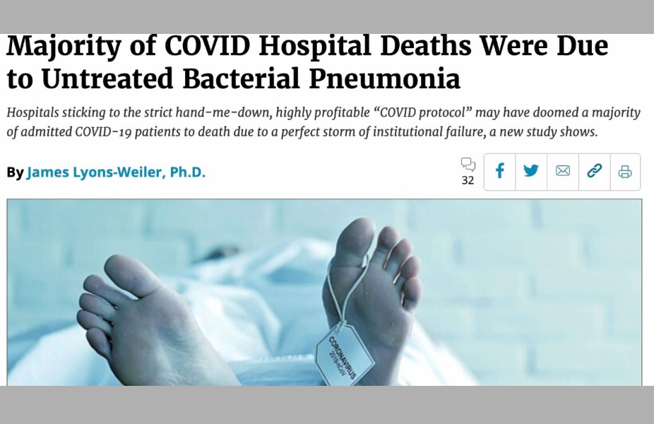 Dr James Lyons-Weiler, an American scientist discredited by big pharma and the government, is adding his voice to what many of us reporting on COVID have been considering. Lyons-Weiler writes on his substack, “Hospital protocolists sticking to the strict hand-me-down highly profitable “COVID protocol” may have doomed a majority of admitted COVID-19 patients to death due to a perfect storm of institutional failure.” He cites a National Institutes of Health study that found “unresolved respiratory infections–not necessarily those involved in SARS-CoV-2–were present in people who failed to “respond” to mechanical ventilation.” The government-big pharma-media conglomerate COVID handling may be the crime of the century.